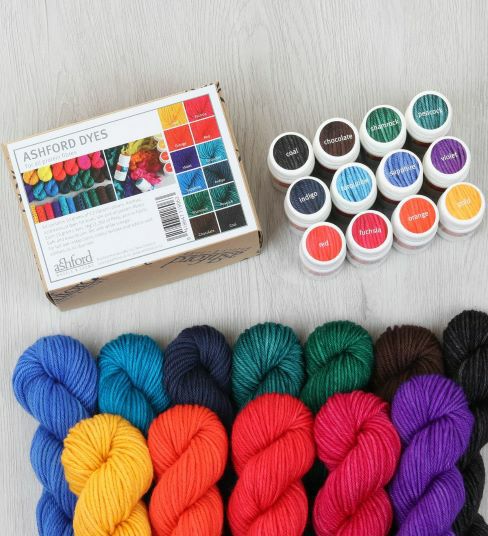 Farbstoffe erfordern weißen Essig als Beize und Hitze zum Aushärten (Mikrowelle, Herdplatte oder Dampf). Herstellung der Färbelösung: 10 g Färbepulver in etwas heißem Wasser auflösen. Nach dem Auflösen genügend kaltes Wasser hinzufügen, um die Lösung auf 850 ml zu bringen. Fügen Sie 150 ml weißen Essig hinzu. Dies ergibt eine 1%ige Farbstofflösung, die 1 kg Faser oder Garn färbt.
