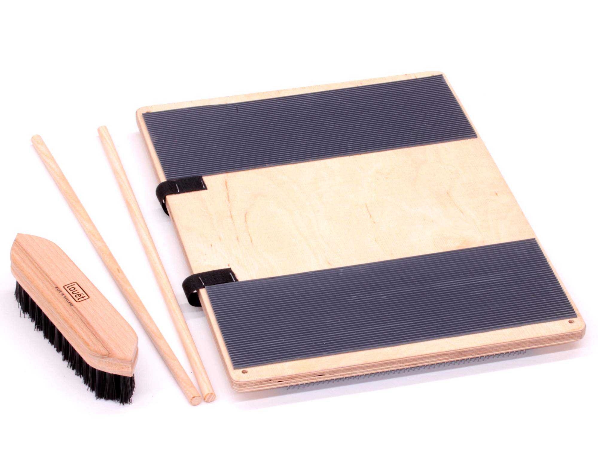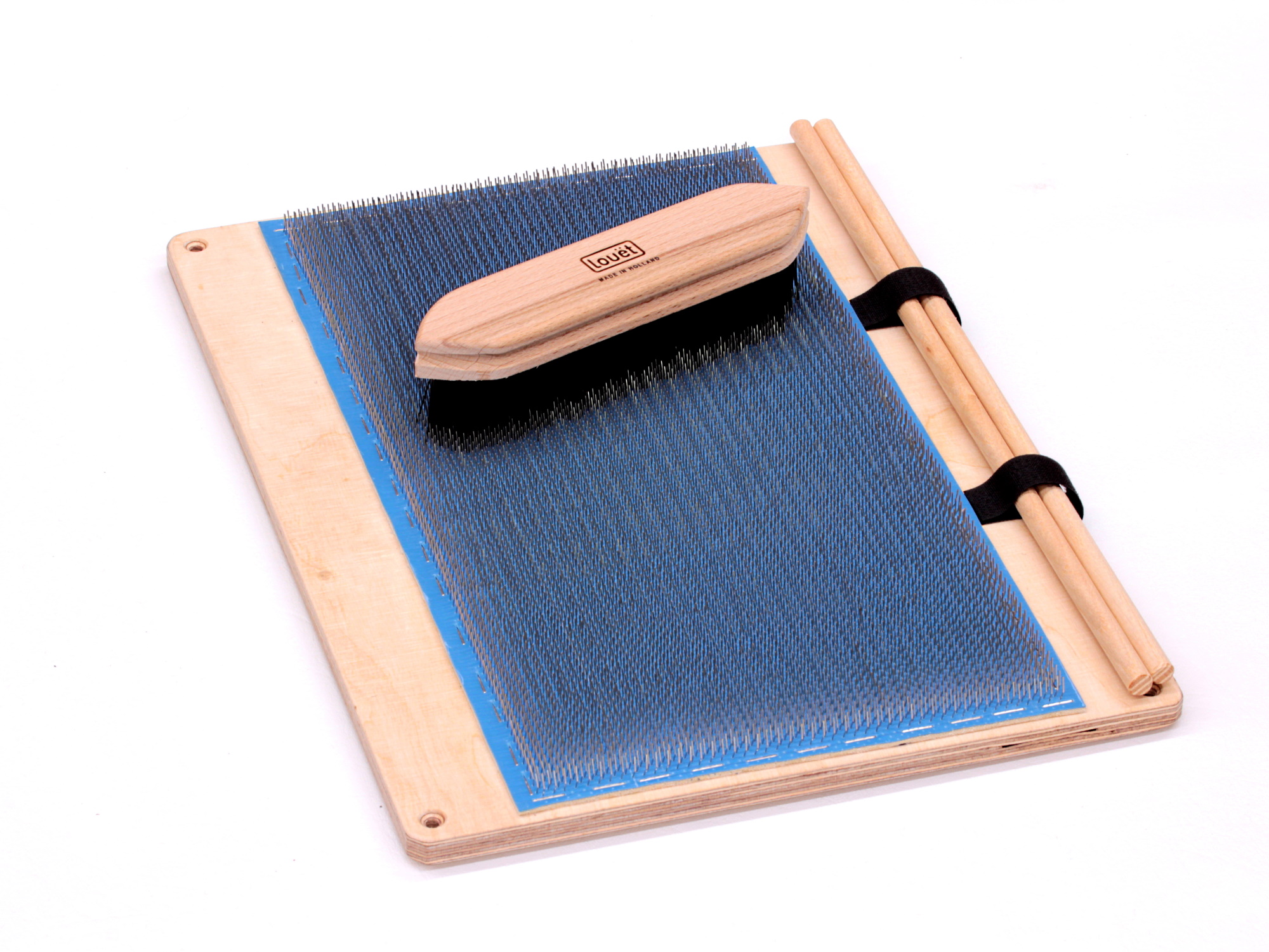 Eine Mischbürste von Louet (KR0119) für das Verkämmen der Fasern und zwei Rundholzstäbe zum Strecken und Abnehmen der Rolags liegen bei.