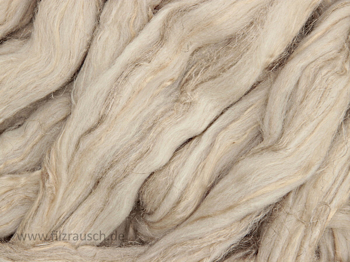 Wir bieten hier ein sehr schönes Gemisch aus Leinenfaser, naturfarbenerTussahseide und einer feinen Südamerikanischen Merinowolle (23 mic) an. Das Mischungsverhältnis beträgt 15% Tussahseide, 15% Leinen und 70 % Merinowolle.