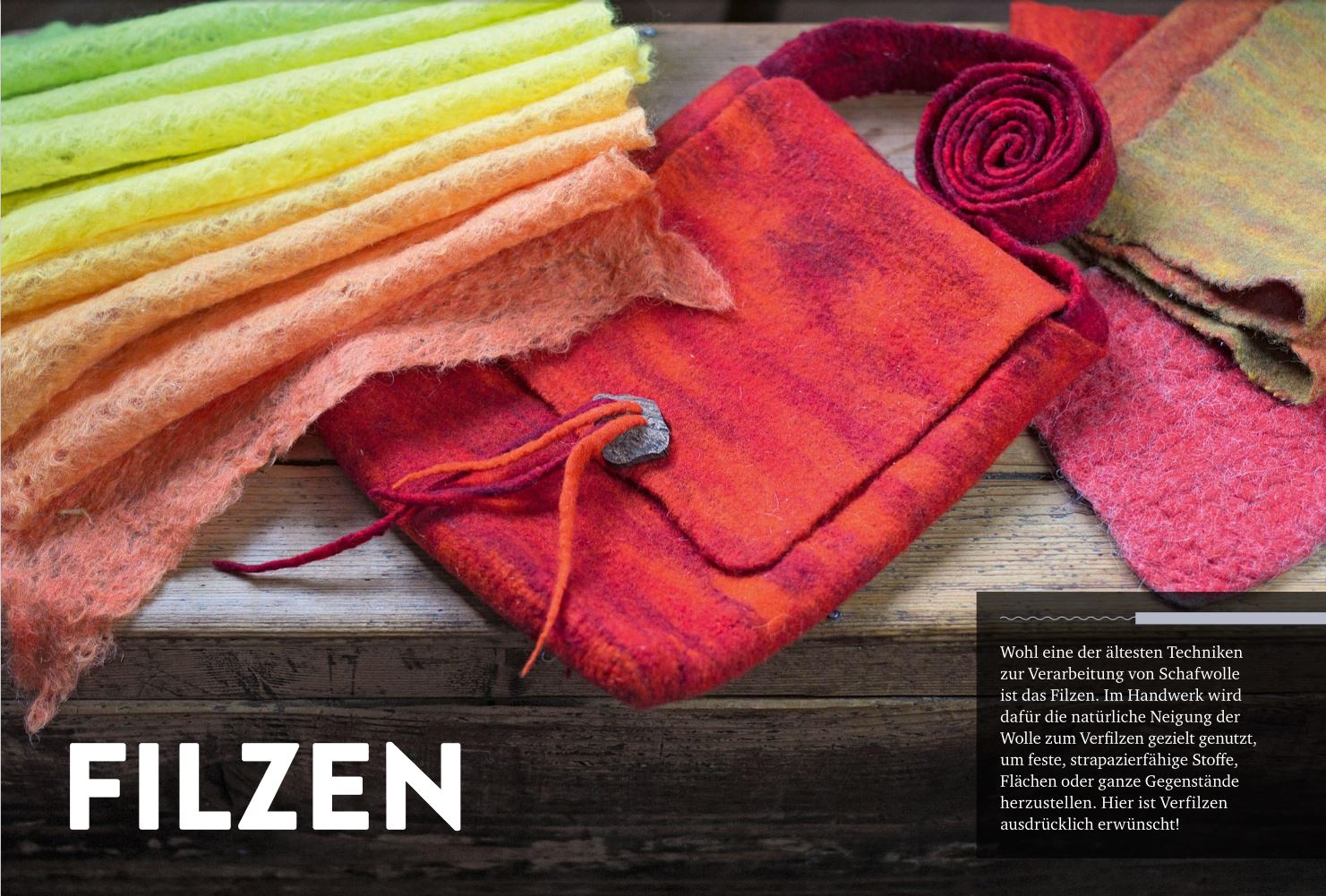 Worauf ist bei der Vliesauswahl zu achten? Welche Schafrassen eigenen sich für welche Werkstücke? Wie muss ich die Rohwolle waschen, kardieren oder kämmen? Spinne ich lieber mit Handspindel oder Spinnrad? Was ist Artyarn? Worauf muss ich beim Nassfilzen achten und was ist der Unterschied zum Nadelfilzen?
