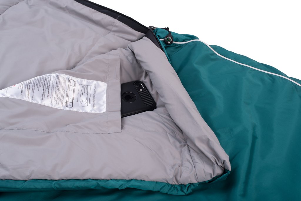 - Koppelbar: Der Schlafsack kann mit einem Exemplar der gleichen Serie, das den Zipper auf der anderen Seite hat, zum Doppelschlafsack verbunden werden.