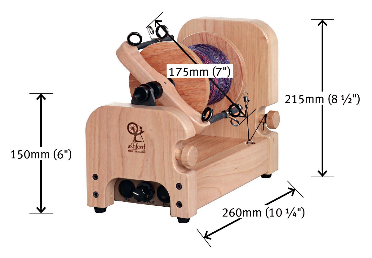 Die Universität von Canterbury unterstützte die Entwicklung dieses optimalen motorisierten Spinners. Leiser Motor, Vor- und Rücklauf, stufenloser Geschwindigkeitsregler (0-1800 UPM) sowie einstellbare Stromzuführung auf 110 V oder 220 V, handbedienter Ein-/Ausschaltknopf, Vor-/Rückwärts Umschaltknopf, Geschwindigkeitsregelung. Einstellbare Spulenbremse, besonders für weiche und dünne Garne geeignet.