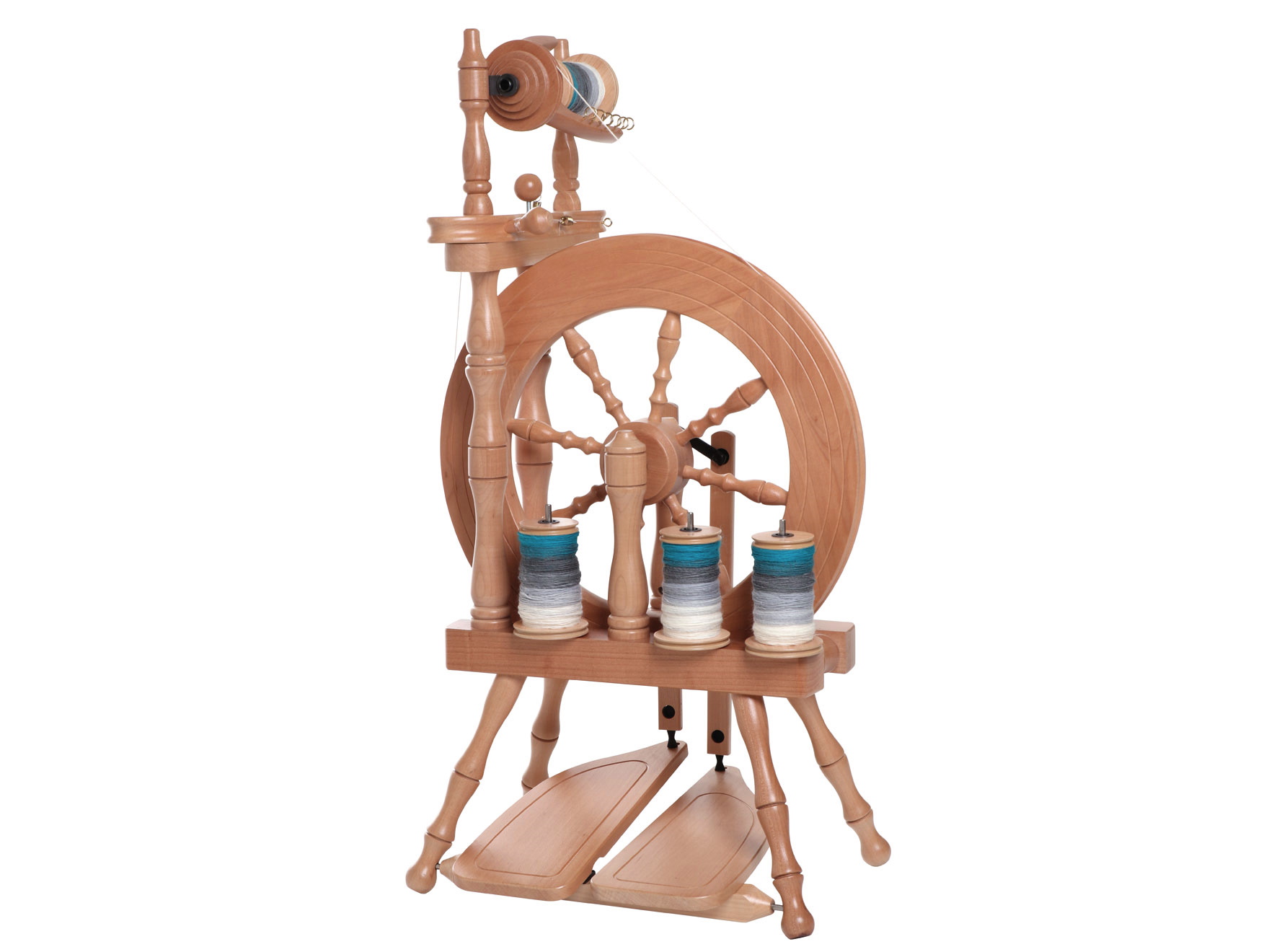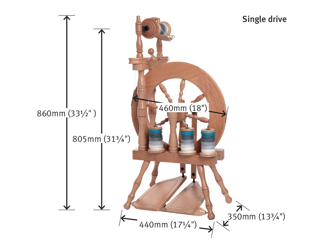 Es ist zusätzlich mit einer Spulenbremse ausgerüstet für weiche Garne und Effektgarne. Das Spinnrad ist komplett mit 4 Spulen ausgestattet; die Spulenhalterung (Zwirneinrichtung) ist im Spinnrad integriert. Das Traveller wird im Bausatz geliefert.