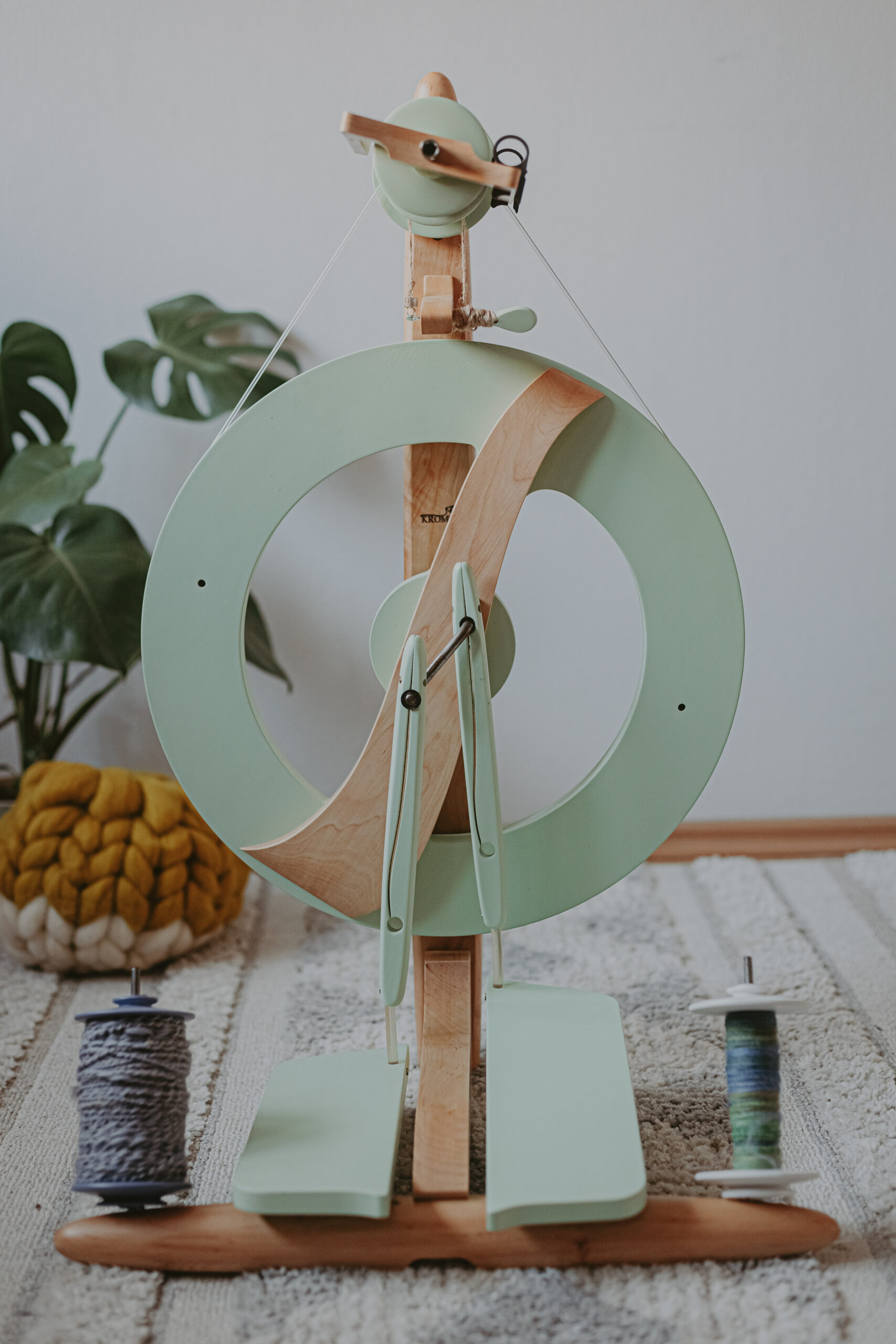 Spinnrad in mintfarbenlackierter Ausführung